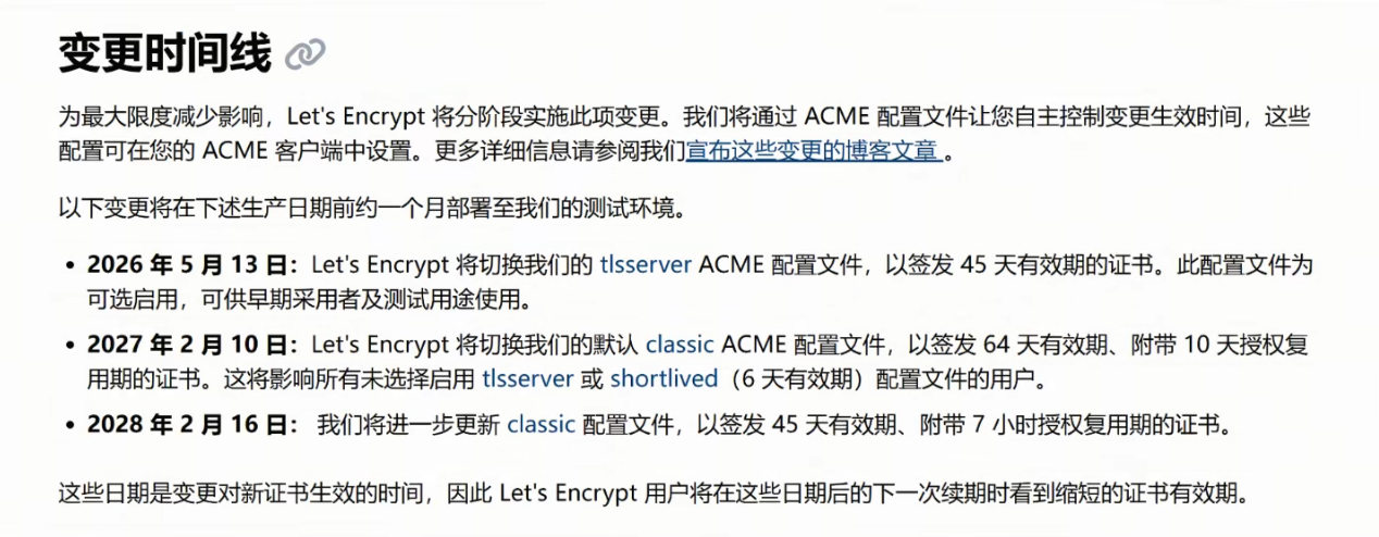 为降低影响,Let's Encrypt将通过ACME配置文件让用户自主控制变更节奏,且所有调整会先在测试环境验证,再逐步推送到生产环境。具体时间线如下: